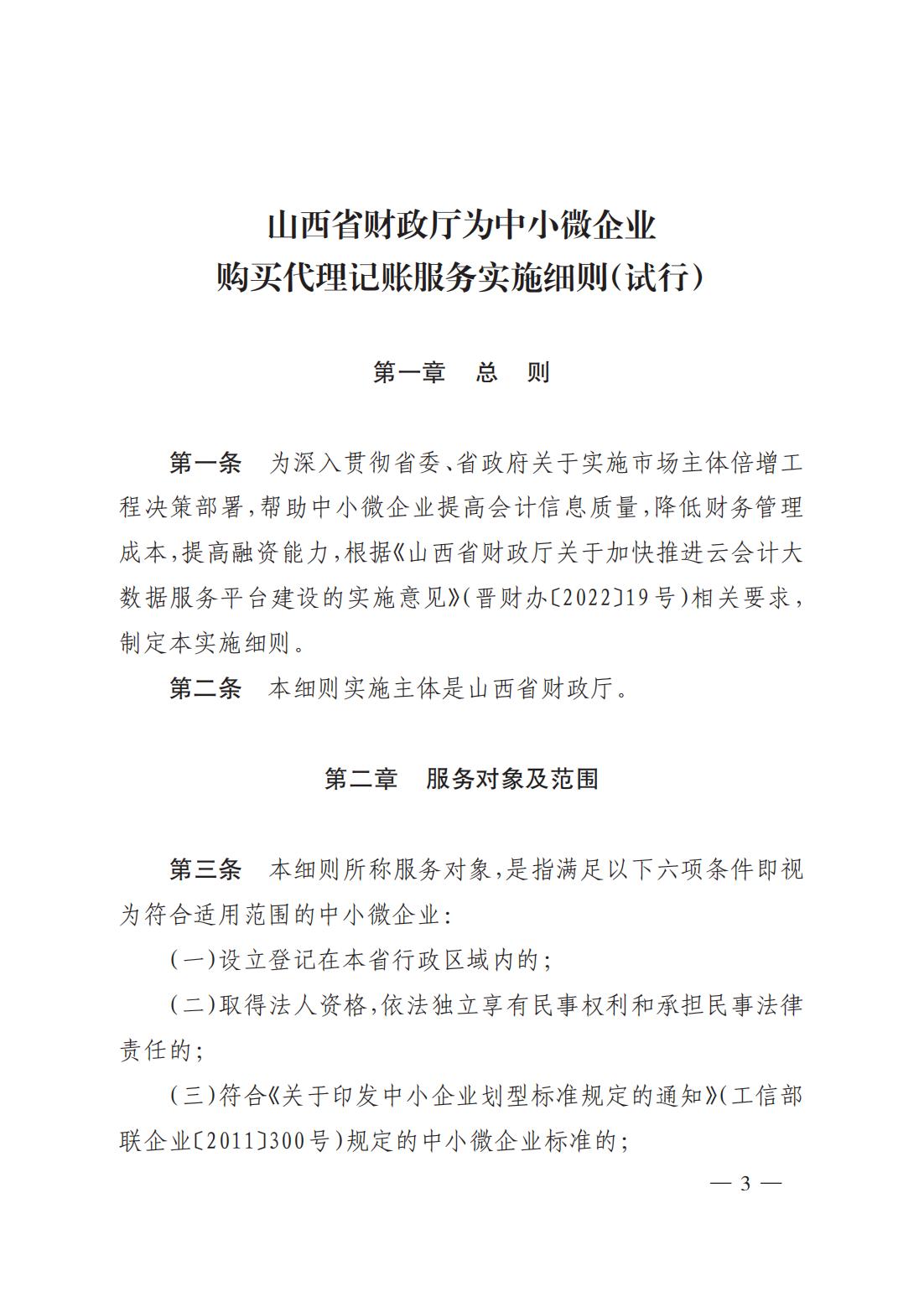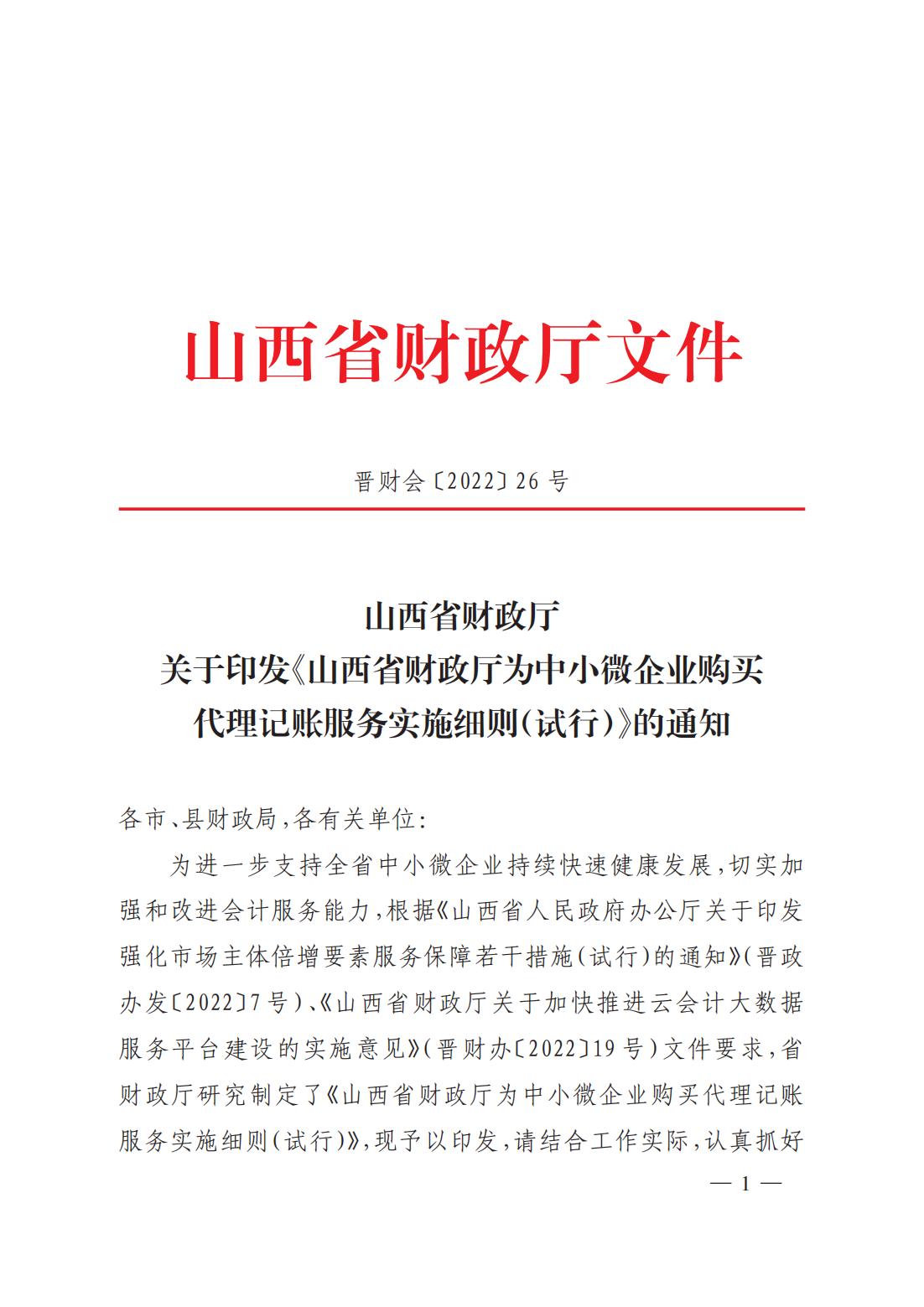為進一步支持全省中小微企業持續快速健康發展,切實加強和改進會計服務能力,根據《山西省人民政府辦公廳關于印發強化市場主體倍增要素服務保障若干措施(試行)的通知》(晉政辦發〔2022〕7 號)、《山西省財政廳關于加快推進云會計大數據服務平臺建設的實施意見》(晉財辦〔2022〕19 號)文件要求,省財政廳研究制定了《山西省財政廳為中小微企業購買代理記賬服務實施細則(試行)》,現予以印發,請結合工作實際,認真抓好貫徹落實。